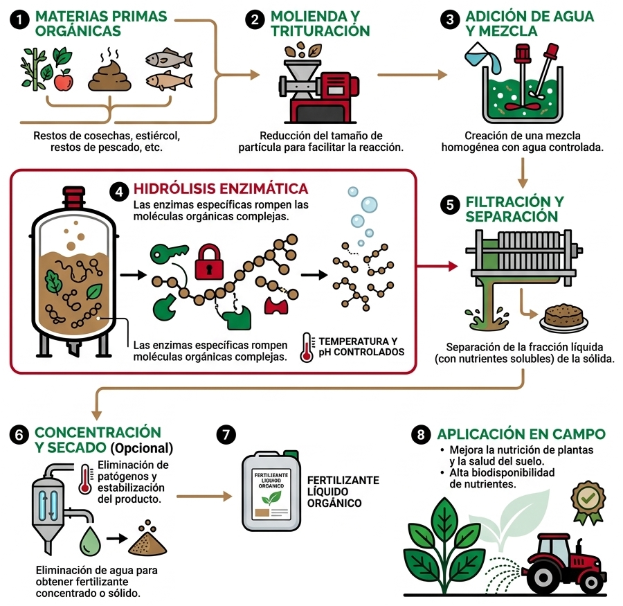 La hidrólisis enzimática es el mejor proceso biotecnológico para la fabricación de fertilizantes orgánicos. Utilizando enzimas (generalmente proteasas) para descomponer proteínas complejas de origen animal o vegetal en péptidos y aminoácidos libres de alta calidad, operando bajo condiciones suaves de temperatura y pH.